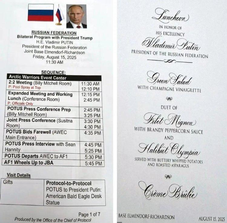 这份被泄露的文件极其详细,几乎就是整个“普特会”的流程“剧本”:不仅包括每分钟的议程安排,还展示了13名核心人员的详细资料,其中包括3个人的手机号码、会议室编号及用途、安保动线与人员安排、对话大体方向,甚至午餐的每道菜。